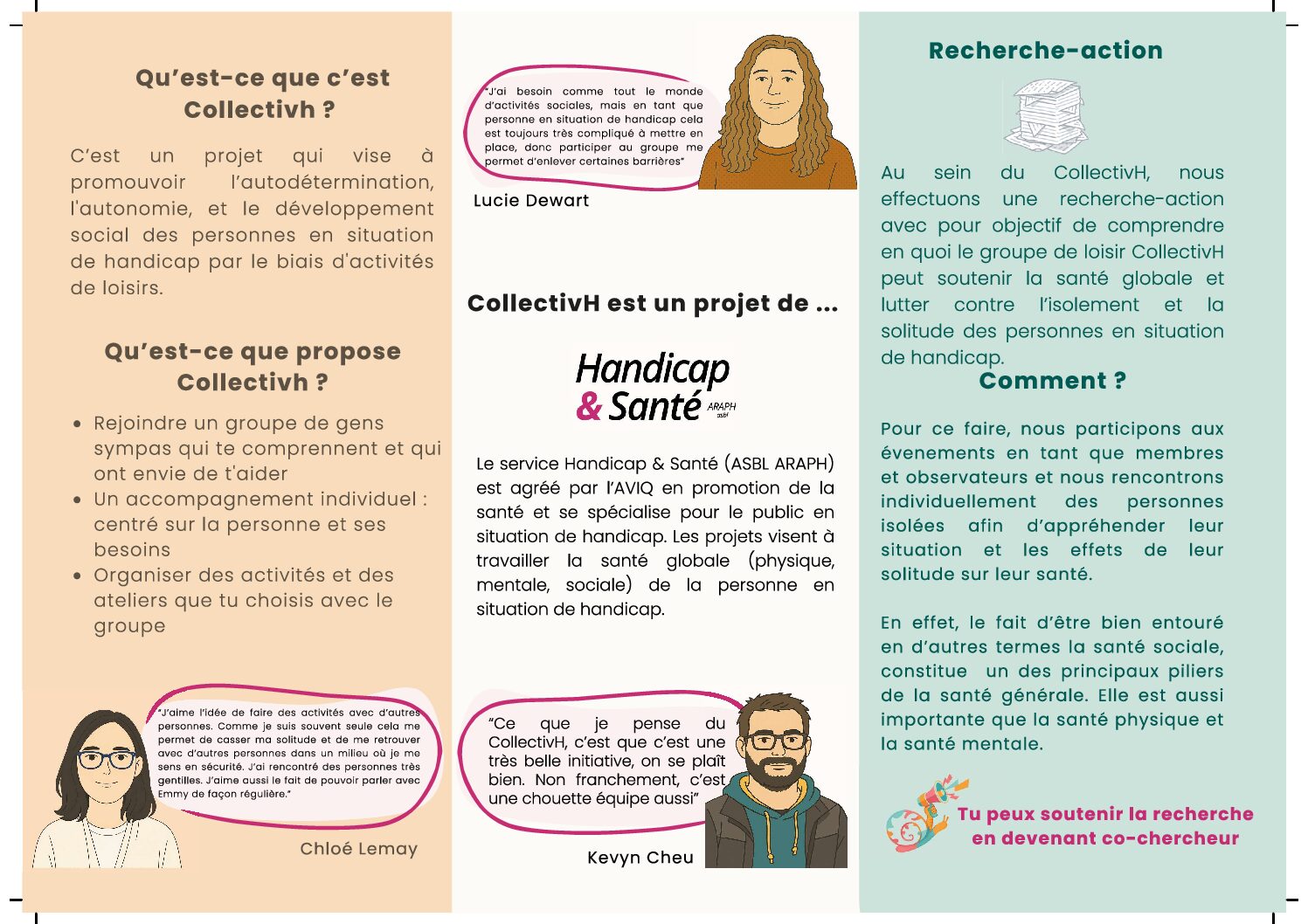 Nous effectuons une recherche action avec l’objectif de comprendre en quoi le groupe de loisir Collectivh peut soutenir la santé globale et lutter contre l’isolement et la solitude des personnes en situation de handicap.